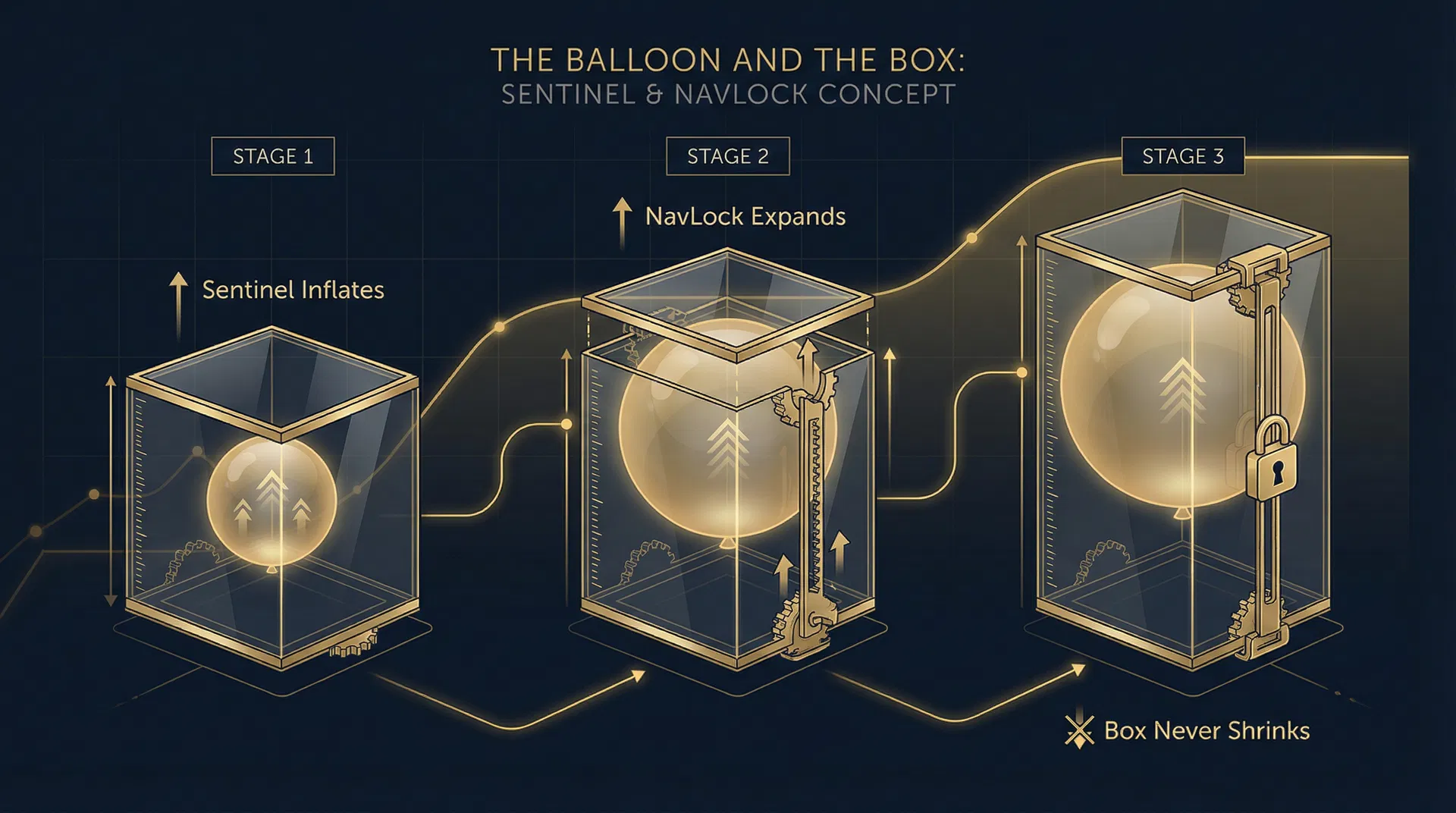 When the balloon fills the box, NavLock permanently enlarges the protected NAV floor. At every observation point, the box ratchets to its new, larger size.